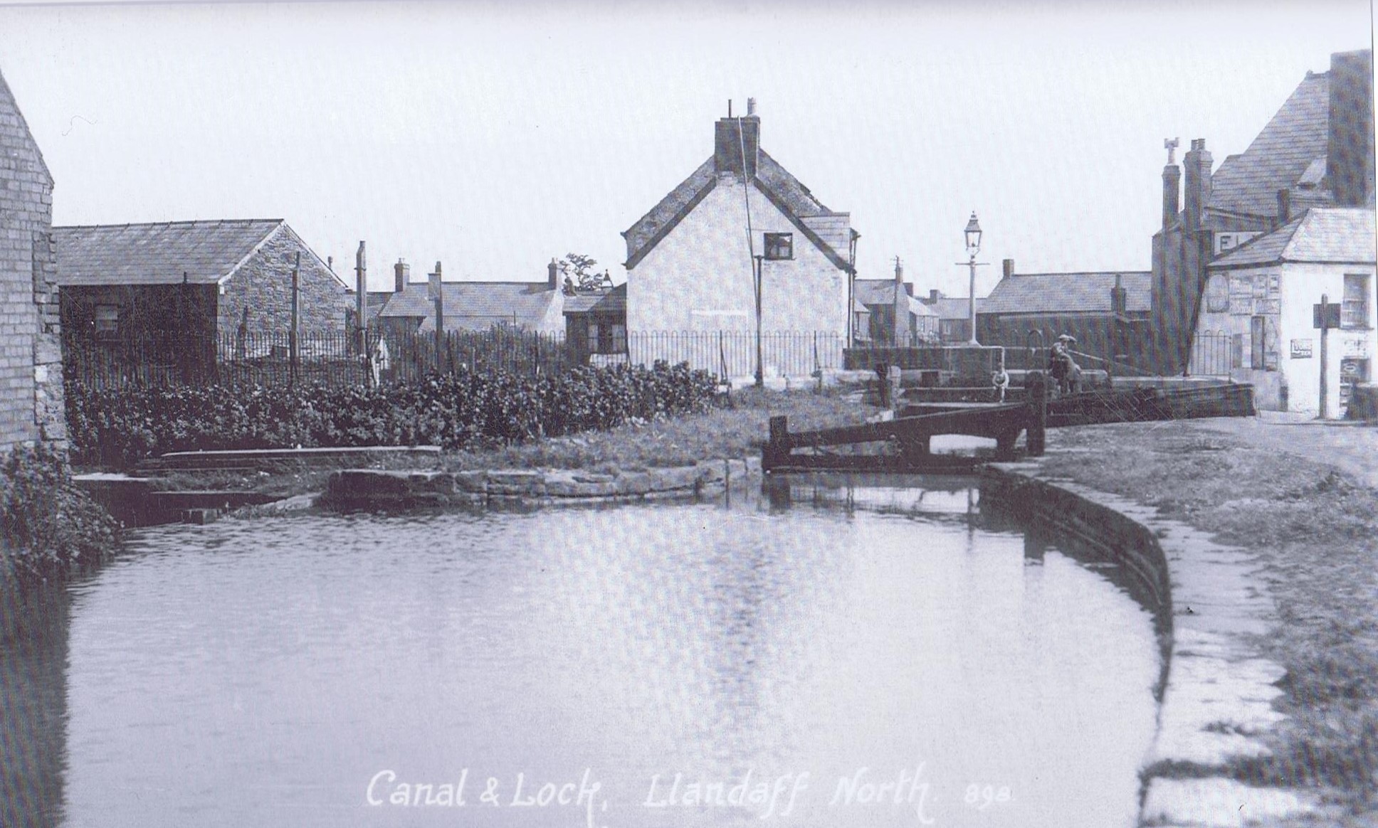 The barges were all of a standard design and were all horse-drawn. There were sections of canal which were widened to allow the barges to pass one another, and basins for barge turning. At Melingriffith there was a basin and a branch canal to allow barges to enter the works. At Tongwynlais and Llandaff Yard were wharves where barges could be maintained and repaired. The photograph below (courtesy of Stephen Rowson and his book Glamorganshire and Aberdare Canals: Vol 2) shows the lock and basin at Llandaff Yard adjacent to the Cow & Snuffers Pub. The Tivoli petrol station now stands where the single-storey buildings are in the photograph