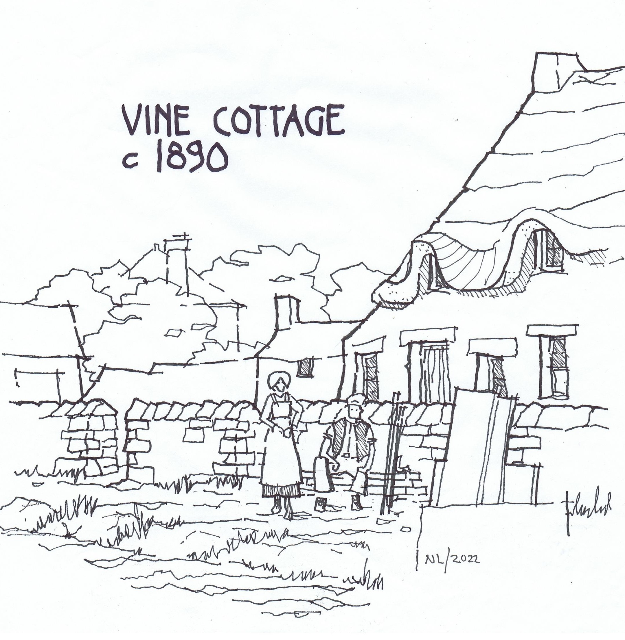 The sketch below is based on the old photograph and shows Eli and his wife outside the cottage