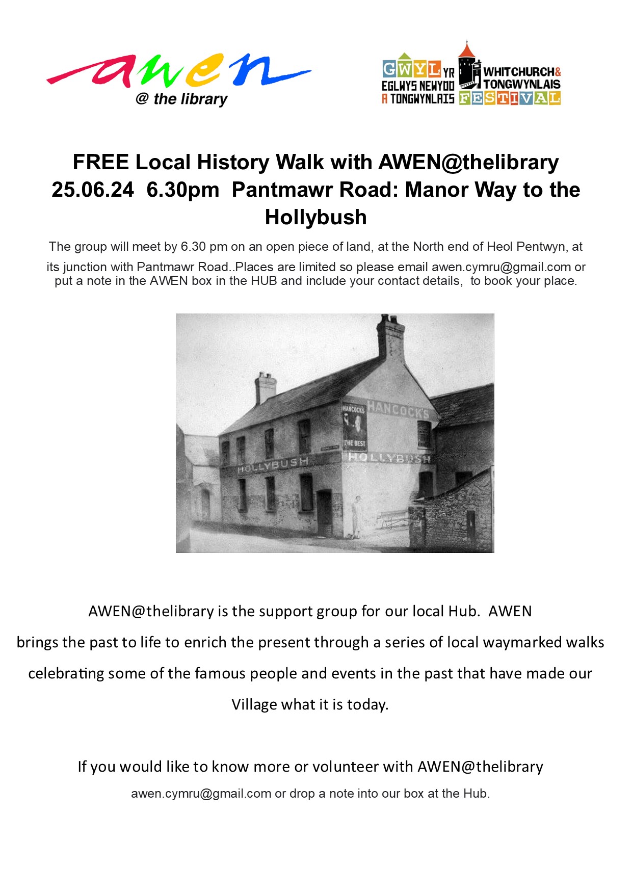 Explore the other walks on this site, join AWEN@thlibrary by completing a form at Whitchurch Hub or email awen.cymru@gmail.com