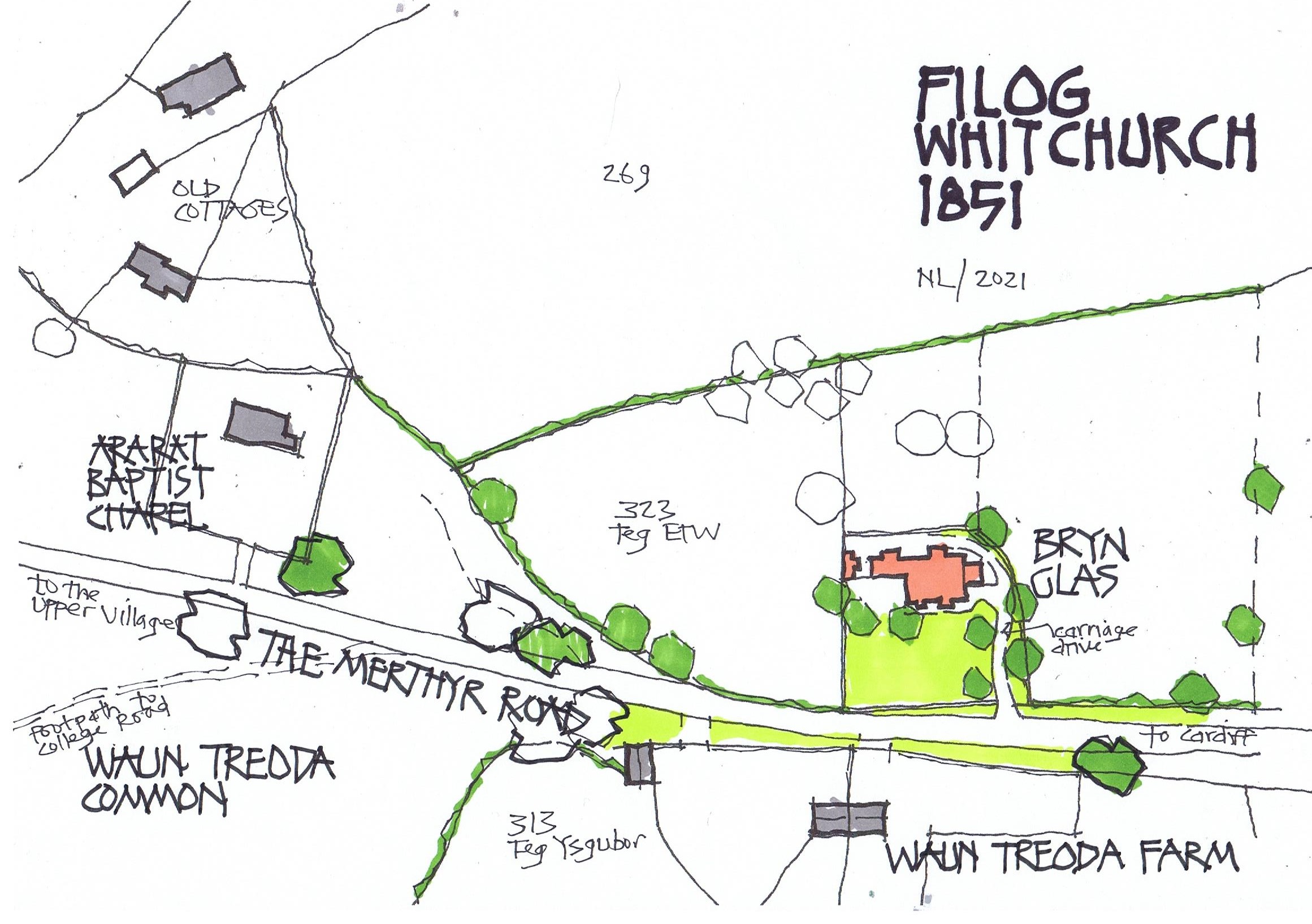 Around this time, on the north side of the Merthyr Road a large detached house was constructed called Bryn Glas. This is shown on the OS map of 1880 set back from the road with a sweeping driveway. The sketch below gives a flavour of how Bryn Glas might have appeared in 1851, with its tree-lined carriage drive and landscaped front gardens. There seems plenty of space around the house for the pleasure garden that would come next. Was Bryn Glas built by William Vachell as his home in the census? There don’t seem to be any other candidates.