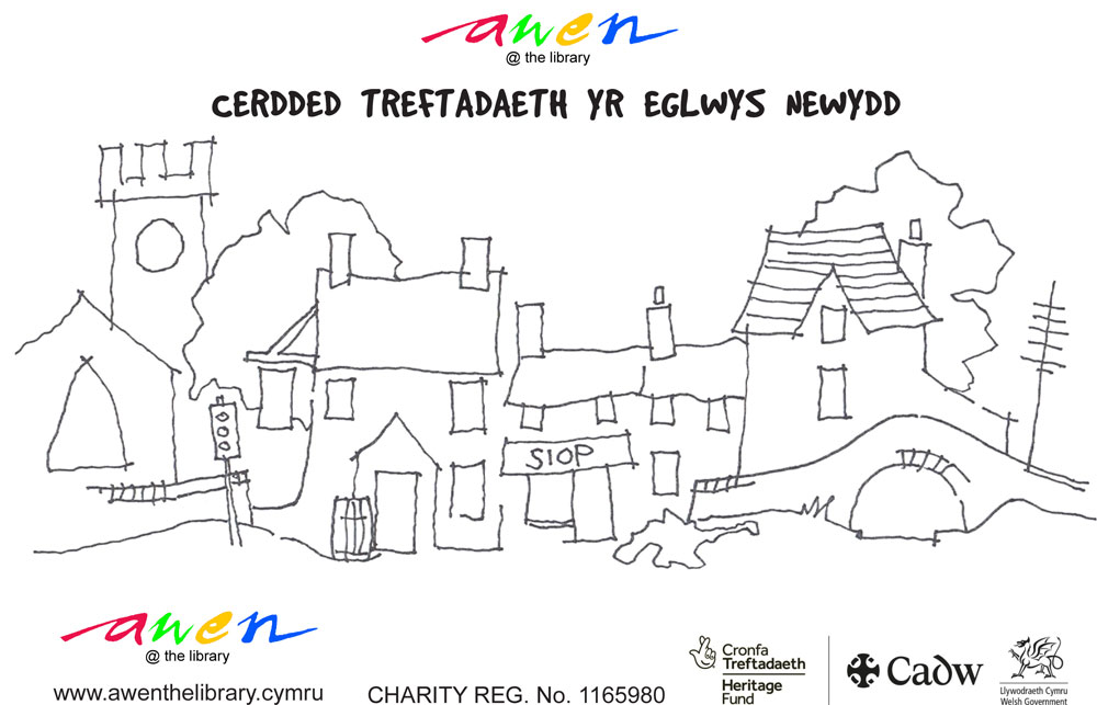 Mae'r braslun yn dangos sut oedd Vine Cottage o bosibl yn edrych yn 1892 gyda waliau gwyngalchog a ffenestri bychain.